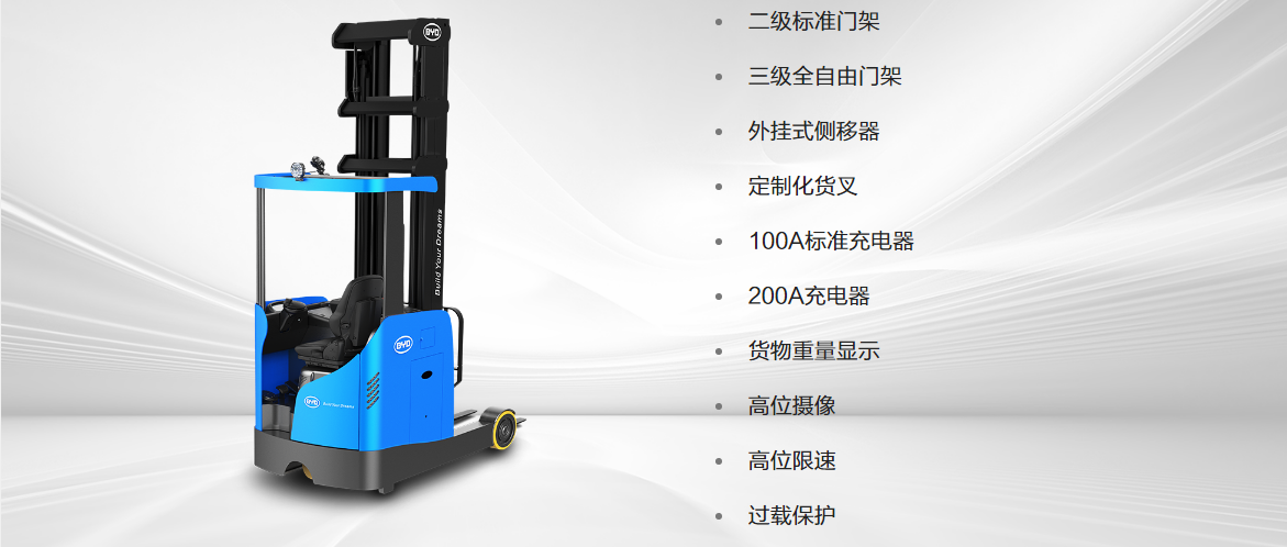 偏置式自由缸设计,使得驾驶员视野更宽阔;门架起升高度在8至8.5m段具有缓冲功能;OPS座椅、超载保护、高位倾角保护、能量再生制动。
