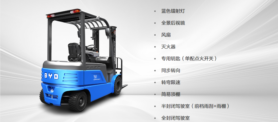 整车配置驻坡保护、超载保护、高位倾角保护、整车断电保护、转弯限速、门架低位缓冲等功能,确保叉车始终处于安全工作状态;倒车警示灯、倒车语音提醒等设置,提高人员安全保障。